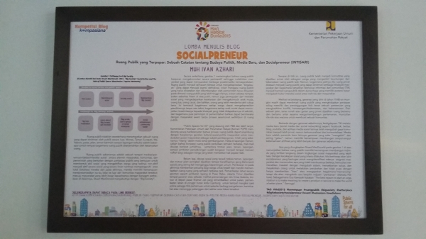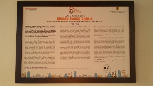 Seperti yang kita ketahui bersama, untuk memperingati Hari Habitat Dunia 2015, Kementerian PU-PERA sebagai pelaksana tugas di Indonesia, menggandeng Kompasiana untuk menyelenggarakan blogcompetition dengan tema persis dengan tema Hari Habitat Dunia 2015, Public Space For All atau Ruang Publik Untuk Semua dan yang menarik, ternyata 10 (sepuluh) karya blogger Kompasiana yang terpilih juga dipamerkan oleh pihak panitia, berdampingan dengan potret-potret masyarakat urban perkotaan dengan tema yang sama. Karya tulisan blogger Kompasiana yang terpilih diambil intisarinya dan dikemas dalam bentuk feature pendek yang dicetak pada bahan seperti plastik yang tahan air (tidak memerlukan kaca/mika untu pelindung) dan dipigura dengan ukuran sekitar 60x40cm. Cantik dan elegan! Ada tambahan perasaan bangga bila memandangnya..... (penampakannya bisa dilihat di bawah!).