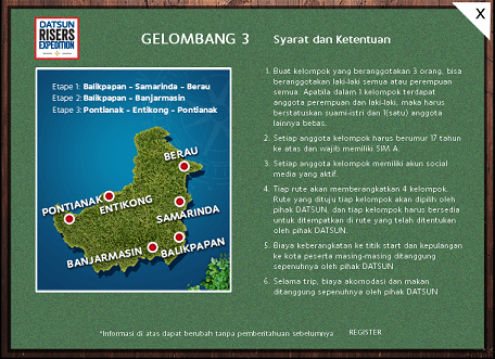 Durian Runtuh di Kalimantan Woooow Kereeeen! itu yang pertamakali mencuat dari benak saya ketika membaca di Kompasiana, akan ada even Kompasiana Blog Trip - Datsun Risers Expedition yang akan melintas dan menjelajahi eksotisnya alam liar Pulau Kalimantan, dari Tanjung Redeb, Berau Kalimantan Timur sampai ke Kota Pontianak di Kalimantan Barat.Ck...ck...ck....ini even langka yang nggak boleh dilewatkan! ....waduh! Batas pendaftaran untuk etape 1 untuk jalur Samarinda-Tanjung Redeb hari ini terakhir? Masih sempat gak ya...? Wis pokoknya daftar aja dulu, diterima apa nggak itu urusan yang diatas (sama urusan admin kompasiana kali ye....he..he..he...). Alhamdulillah siang itu dalam tempo yang secepat-cepatnya semua persyaratan yang diminta admin Kompasiana siap dan beres untuk di kirim ke petugas berwenang...dan Alhamdulillah, akhirnya jadi juga saya bergabung dengan rekan-rekan dari seluruh Indonesia dalam Datsun Risers Expedition menjelajahi wisata pulau terdepan! Inilah yang saya bilang sebagai durian runtuh di Kalimantan. Even ini merupakan berkah untuk pariwisata Kalimantan, khususnya daerah yang dilintasi oleh para risers (sebutan untuk peserta Datsun Risers Expedition), karena mendapatkan media promosi pariwisata paling efektif dan efisien, gratis lagi.....! Kenapa efektif dan efisien? Para risers terpilih yang nantinya menjelajahi Pulau Kalimantan bukan risers biasa yang hanya jago nyetir mobil, tapi mereka adalah kompasianers, yaitu komunitas penulis media blog terbesar dan paling berpengaruh di Indonesia, Kompasiana. Mereka penulis-penulis handal dibidangnya, jadi melalui tulisan para risers-Kompasianers inilah promosi pariwisata Kalimantan akan terekspos ke seantero dunia. Kalau sudah begini, jadinya durian runtuh matang pohon sudah terbelah lagi....he...he...he....cakep banget Datsun-Kompasiana! Terima Kasih Datsun! Terima Kasih Kompasiana! Mudah-mudahan setelah even ini, potensi besar pariwisata Kalimantan yang masih sering terabaikan dan sering timbul tenggelam, bisa segera bangkit dan take off .....